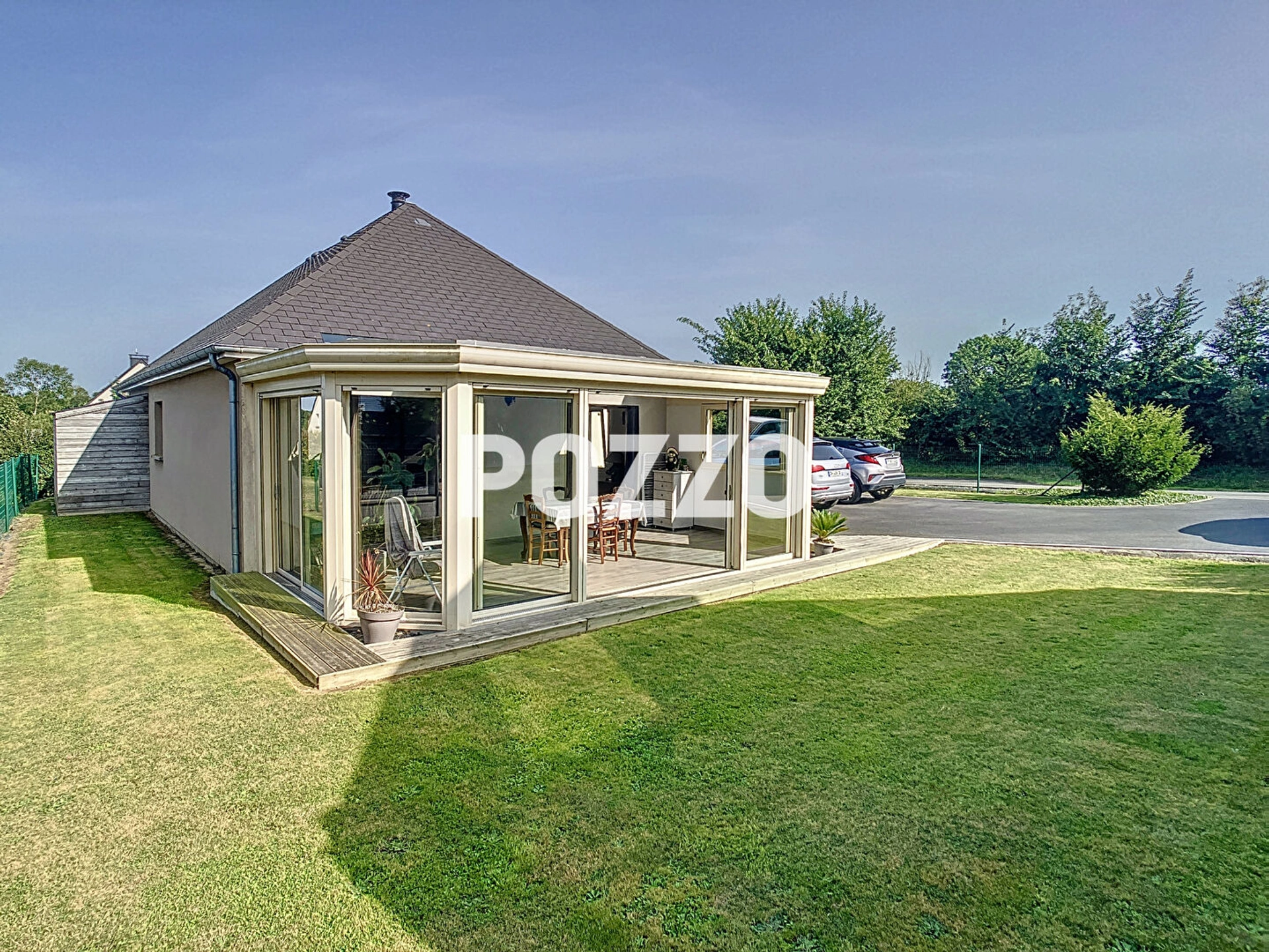 POZZO IMMOBILIER vous propose, au calme, cette agréable maison de plain-pied construite en 2012 comprenant : Un vaste séjour/salon avec une véranda exposée Ouest, une cuisine aménagée et équipée, une arrière cuisine, un cellier, un dégagement avec bureau, une salle d'eau et 3 chambres, un WC. Un abri de jardin et un appentis à bois.