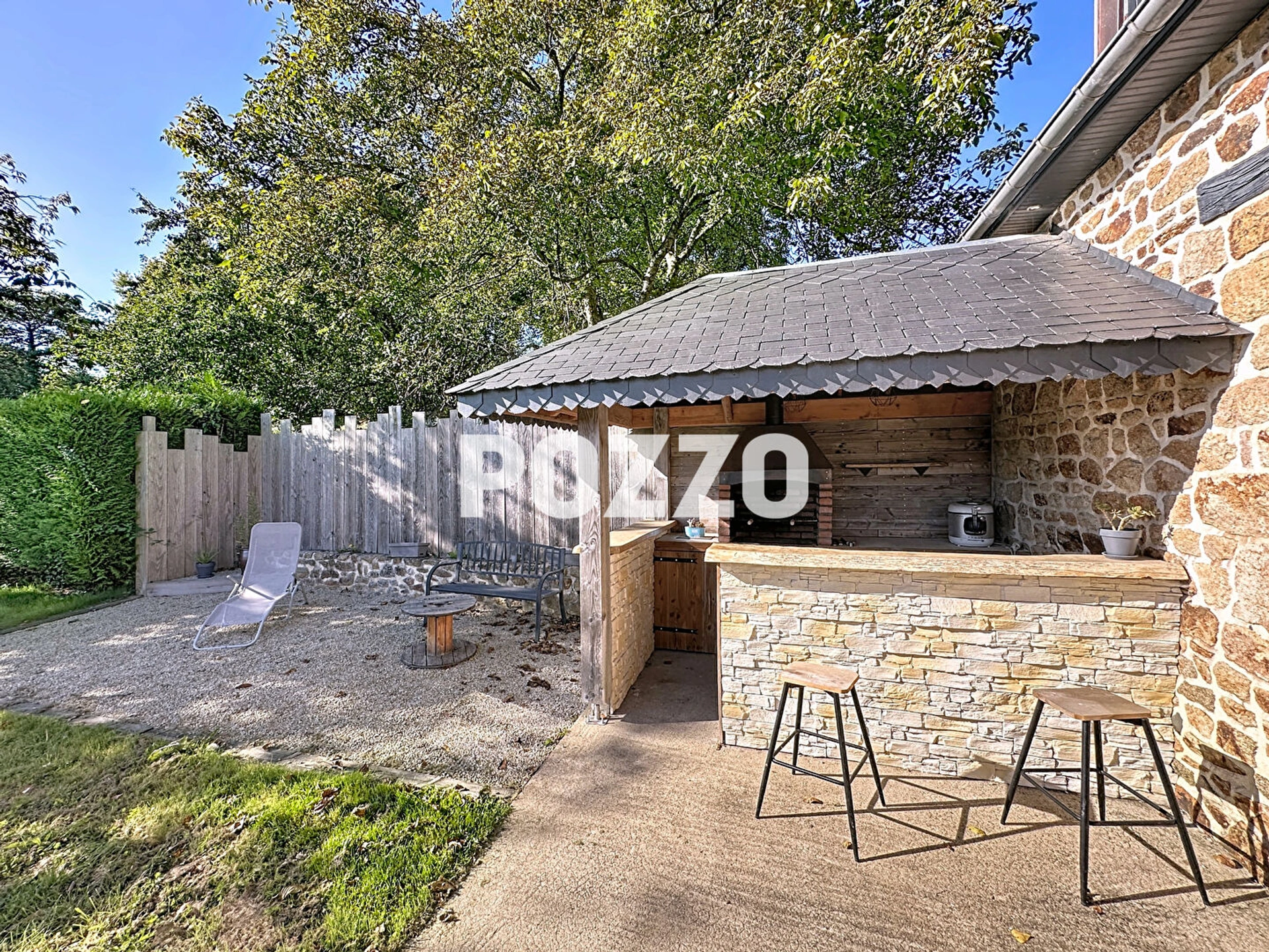 Terrasse avec store ban et coin pour cuisine d'été avec barbecue