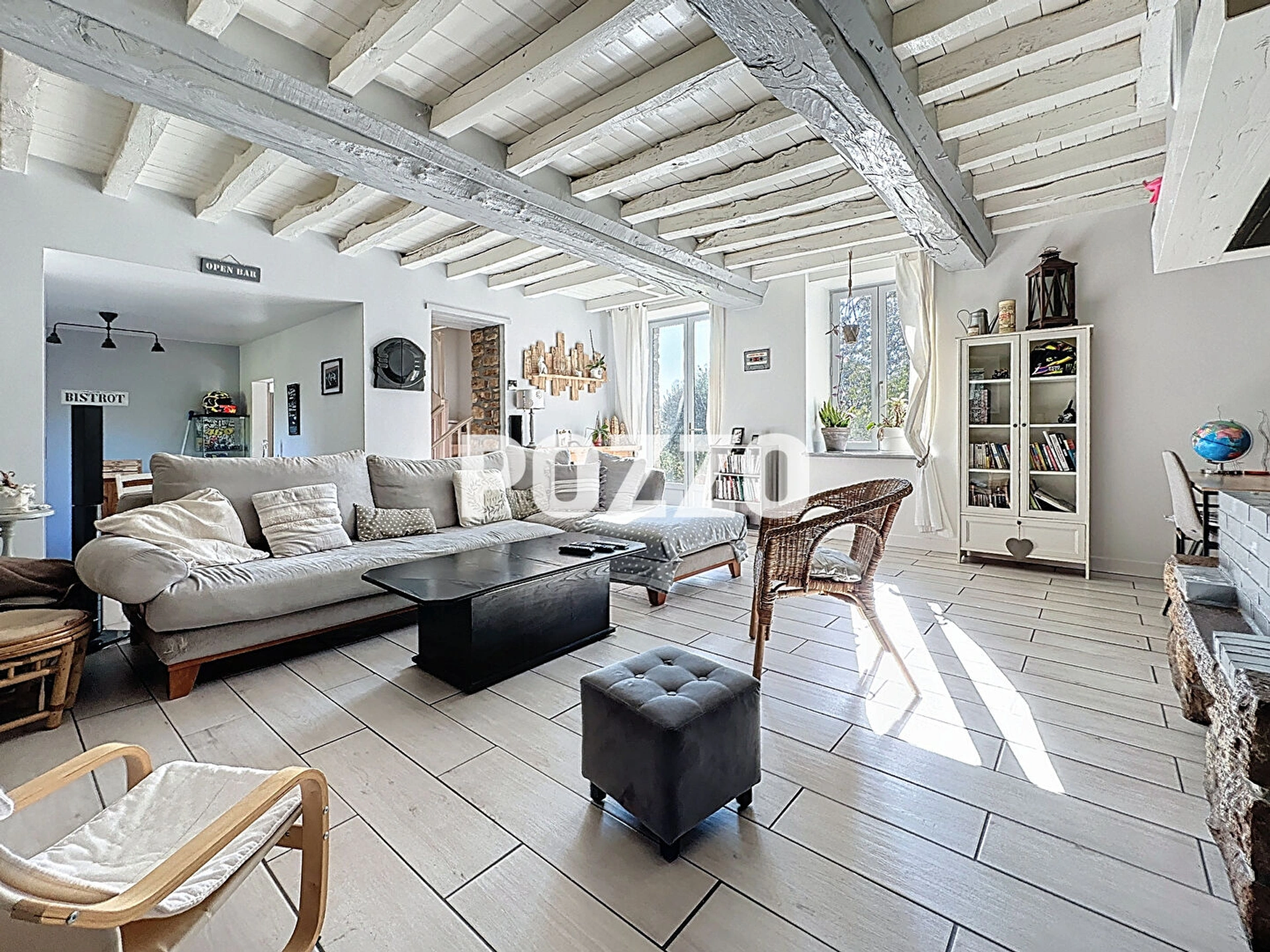 - au rez de chaussée : entrée et placards, salon avec cheminée et coin bar/bureau, cuisine aménagée et en partie équipée, salle à manger avec coin bureau et verrière, chambre, salle d'eau, WC.