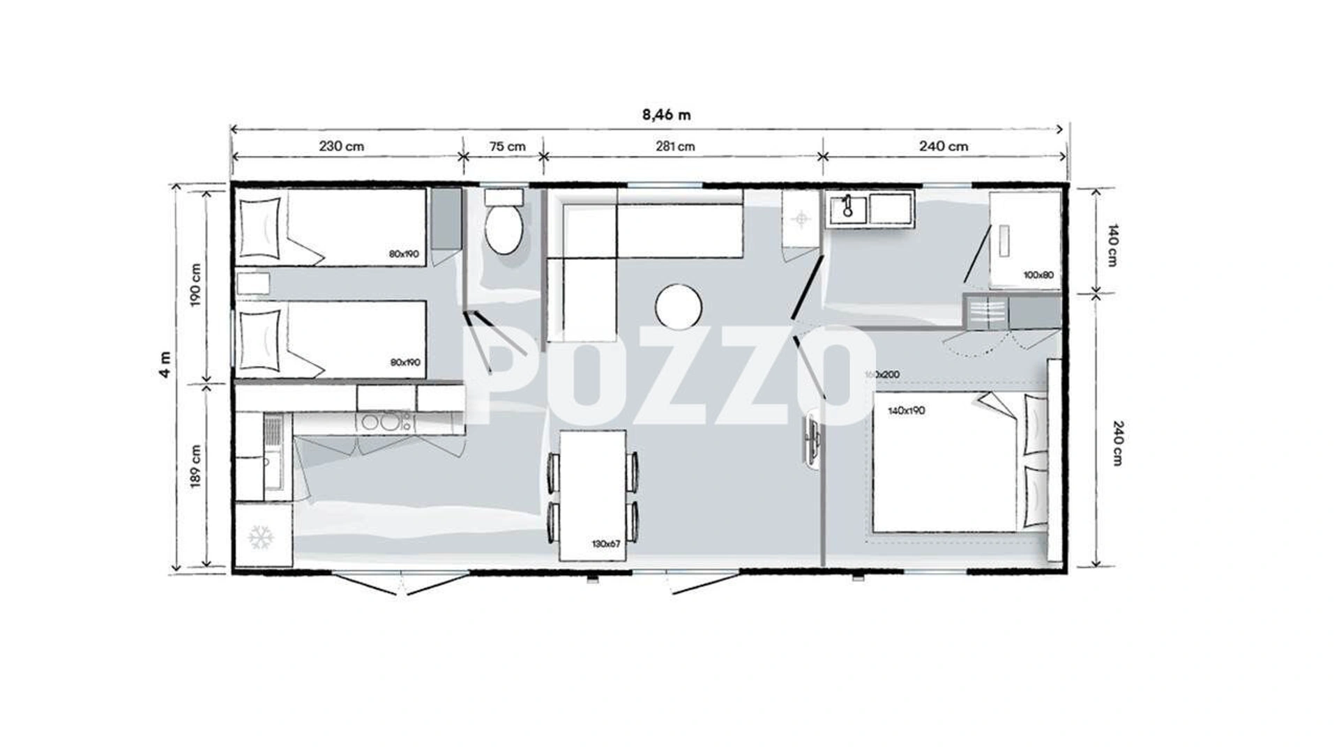 Le modèle 844 2ch est ultra-lumineux grâce à de larges baies vitrées en façade et sa cuisine d'été ouverte vers la terrasse. Sa salle d'eau équipée d'une douche 100x80 cm est idéale pour le confort des vacanciers.