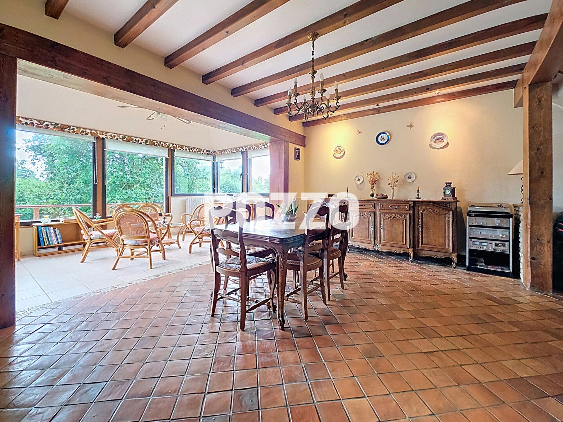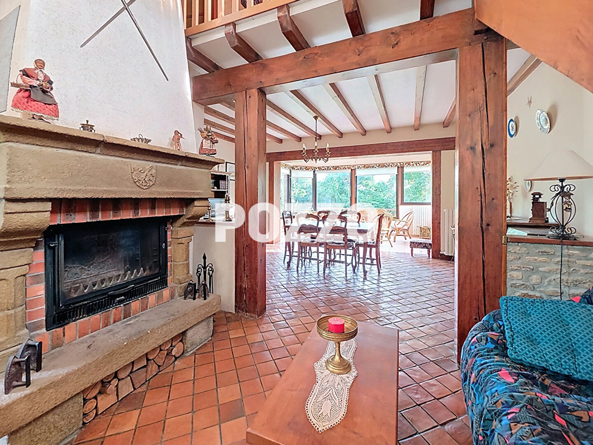 d'une entrée, d'un séjour-salon lumineux avec cheminée et poutres apparentes, parfait pour des moments conviviaux, d'une cuisine aménagée et équipée, wc, de deux chambres et une salle d'eau , pour une vie de plain pied confortable.