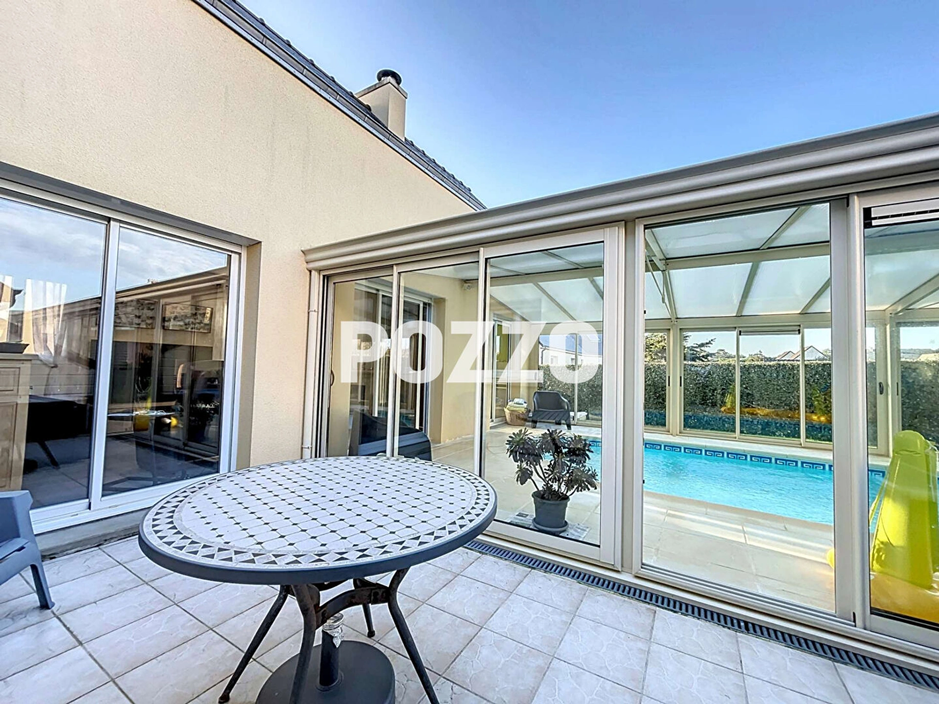Une piscine couverte et chauffée avec pompe à chaleur s'accédant par le salon pour profiter de cet espace détente en hiver comme en été.